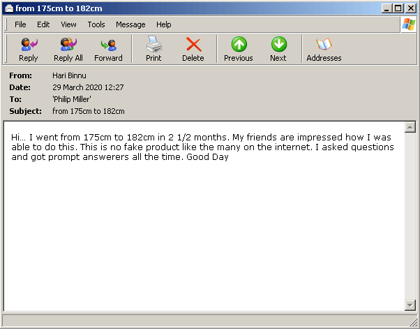 Hi, I would like to thank you for the program that helped me grow 2 inches in just a few weeks. I used to be the short one around but now my height is the same as the other peers.