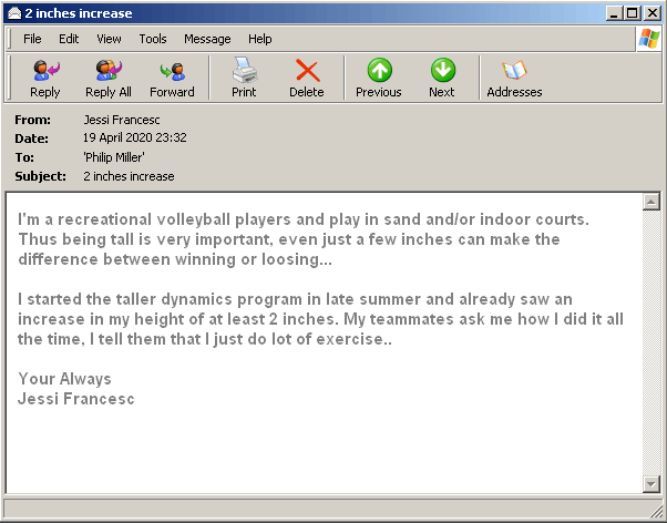 "I tried loads of products to grow taller in the past but with negligible results. Then to my surprise, and having nothing to loose I found myself on a web site that claim to have a scientific way of growing taller. I suddenly bought it and started the program the very same day. Now, I'm please to say that I gained 2 inches without trying too hard."