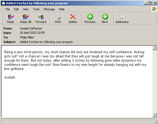 "Being a very timid person, my short stature did only but hindered my self confidence. Asking girls out? not a chance! I was too afraid that they will just laugh at me because i was not tall enough for them. But not today, after adding 3 inches by following grow taller dynamics my confidence went tough the roof. Now thanks to my new height I'm already hanging out with my first girlfriend. Joseph."